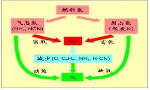 化石燃料中的氮化物,其氮原子的结合力比氮气中的氮的结合力脆弱,故在燃烧过程中容易释放出氮NHi(i=1,2,3)、HCN等化学成分,这些成分即使在较低温度下亦容易生成NOx。