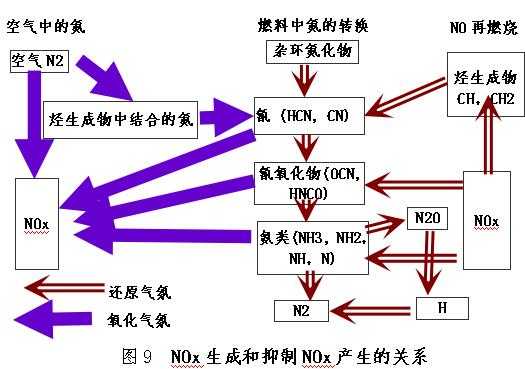 从NOx产生机理得出抑制NOx产生和促使破坏NOx的途径,还原气氛(图中是空心箭头)即抑制和促使NOx破坏的途径