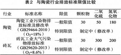 两个行业主要大气污染物排放限值的比较见表2。