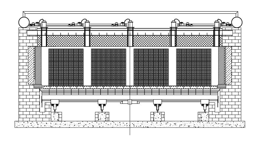 图3为隧道窑断面图,隧道窑采用顶喷外燃烧系统、单壁复合墙和陶瓷纤维模块吊平顶结构,有效控制了窑壁的透热值和蓄热率,根据热辐射效率利用原理和燃烧火焰长度等,一般隧道窑采用大断面低码层结构,可以达到节能和规模化生产。在隧道窑上设置进口端门、截止门和出口供氧门,砍掉了余热回收系统,确保了温度曲线是一个典型的抛物线,充分利用热传导和热辐射原理,有效促进横向走风的气压平衡,控制窑口出砖温度控制在40℃以下,也是焙烧窑节能和走火快的关键。低码层外燃型隧道窑在码坯方式上留有较大的走火风道,防止火焰直接冲刷烧制品,其二必须设置窑车垫层砖,克服气流折射形成的焙烧盲区,即温差产生的生腿砖现象。