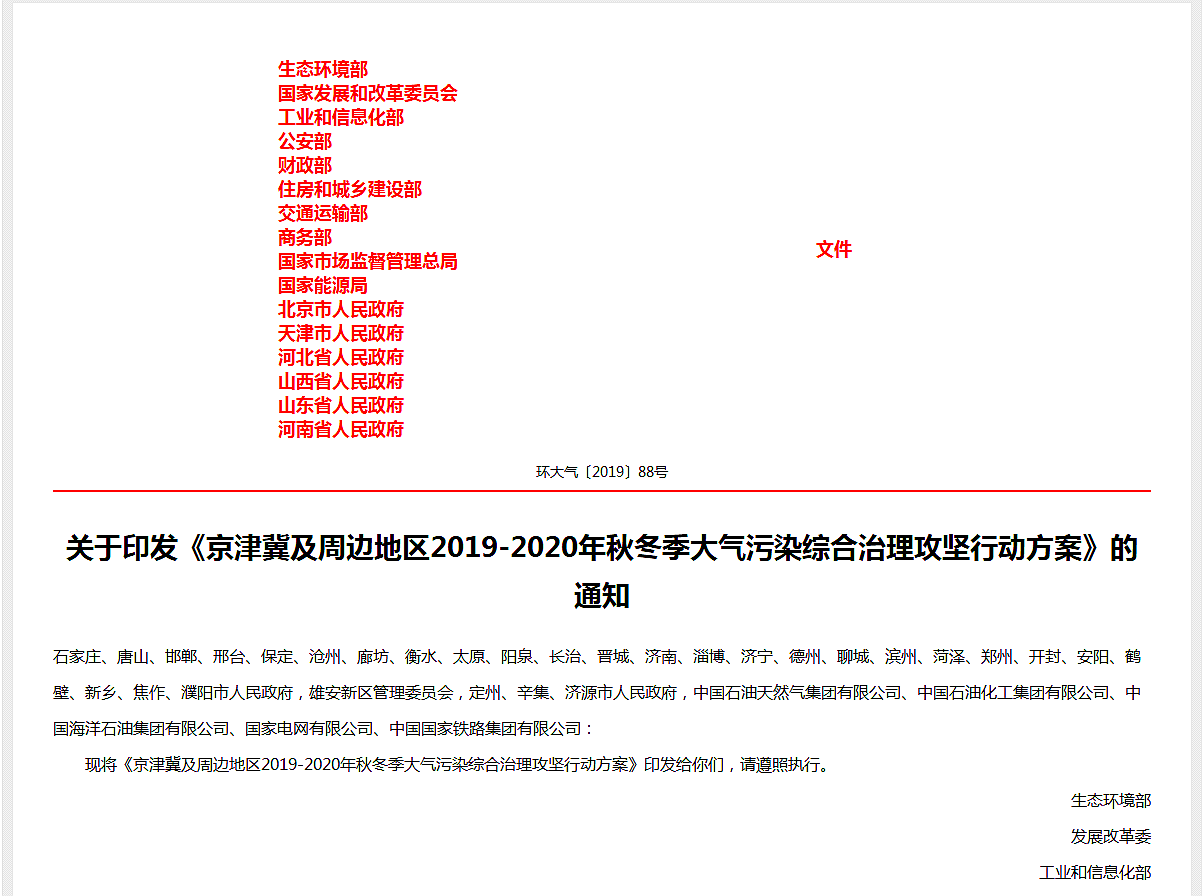 京津冀及周边地区2019-2020年秋冬季大气污染综合治理攻坚行动方案
