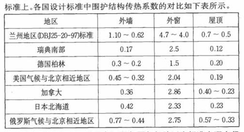 表4[2]、国际上设计标准中围护结构传热系数的对比。