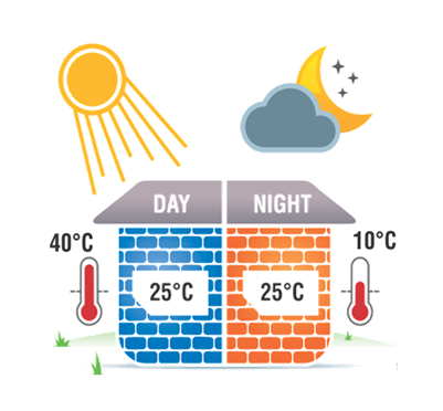 使用垂直孔洞结构保温砖造更好的建筑物: 更健康,更舒适,更经济建造和居住 ,巨大的节能效果,并且减少二氧化碳排放 。