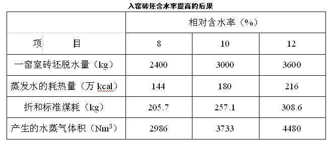 焙烧过程中砖坯要从入窑时的常温升至1000℃左右的高温,在此之前必须先排除所有的残余水分。坯体含水率越高,需要排除的水分越大。假设轮窑一个窑室码坯10000块,每块砖坯重3kg,如果坯体的含水率有8%增加至12%,那么从一个窑室中排出的水的质量要从2400kg增加至3600kg,而为了排除水分所消耗的热量从144万kcal增至216万kcal,相应的标准煤耗量由205kg提高到308kg。也即是说因入窑砖坯含水率的增加,导致烧砖标准煤耗多100kg。