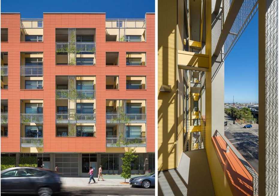 梅里特高级公寓,位于奥克兰唐人街边缘。这个经济实惠的高级住宅区,是近梅里特巴特湖区域中转站地产发展项目中的首例。该建筑所处的良好位置确保了入住居民可以方便搭乘公共交通。景观设计专门选用了当地原生植被,并优先考虑适合当地鸟类种群的植物,为居民提供了观赏鸟类和聆听鸟鸣的生活享受。由于大部分梅里特的居民都是低收入者,建筑的能源系统采用降低能耗的设计,可以减少居民支付的实际能源费用。建筑师在每个房间设计了吊扇的低容量通风循环系统,而建筑所需热量的70%由屋顶太阳能热水器提供。此外,屋顶上安装的光伏发电板可为建筑公共区域提供照明。