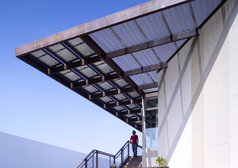 阴阳楼,位于加州威尼斯,是一个集家庭和办公空间于一体的住宅项目。该建筑为改建项目,保留了原有建于1963年的近1200平方米住宅部分,改建中增加了屋顶绿化,一个独立的雨水循环系统,景观设计选取了耐旱本土植物。为了改善室内空气质量,减少污染,设计团队采用无甲醛的家具、低挥发性有机化合物涂料、天然石材和低汞荧光灯具。设计中采用12千瓦的太阳能电池阵列,为住宅提供全部电力需求。太阳能通风烟囱、可调节的窗户和天窗,剔除了机械冷却的耗能,同时也可促进室内热空气上升,并流通至每个房间。