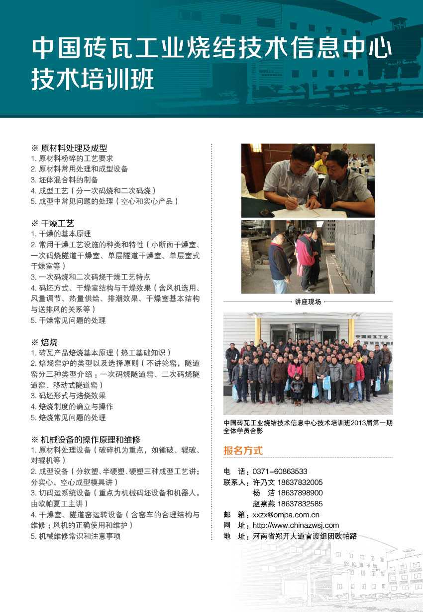 中国砖瓦工业烧结技术信息中心技术培训班第三期将于2013.9.12 -16日开课(9.12报到),特邀行业知名专家曹世璞、湛轩业, 梁嘉琪,黄烈武、。培训内容:烧结砖相关知识与疑难问题解决办法。有疑难问题的企业可将问题汇总,有需要的情况下可拍摄照片带来也可于9月7日前发送至信息中心邮箱xxzx@ompa.com.cn届时专家将在课上统一解答指导。地点:开封市军分区杭州大酒店。标间150元/天(含双早) 届时可自由结合入住。,中餐自理35元/人,晚餐自理,其它费用由中心承担.报名电话:0371-60863533/55/88/99。