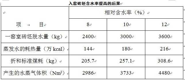 入窑砖坯含水率提高的后果如下表所示