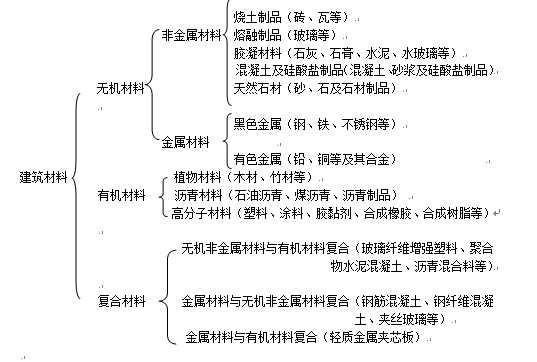 按建筑材料的主要组成成分,可分为无机材料、有机材料和复合材料三大类。具体分类如图所示。
