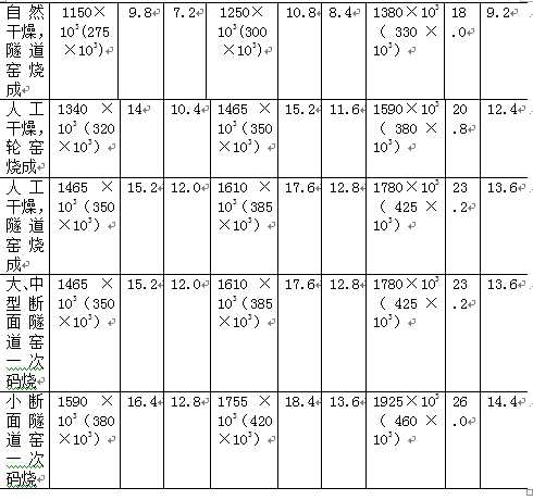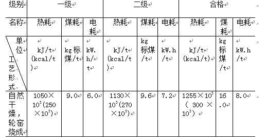 注:1,热耗是由燃料及各种含能工业废渣产生的用于焙烧单位产品所消耗的热量。2,煤耗是用于焙烧单位产品所消耗的各类燃料折合标煤量。包括内掺和外投用煤、干燥用煤以及为加热原料、制砖机组所需的蒸汽用煤和机修方面的用煤。3,电耗是从原料制备至成品堆放的全部生产过程的综合电能消耗量。包括各生产工序动力用电、生产照明用电以及办公室、仓库照明用电。不包括生活用电和基本建设用电。4,确定能耗等级的依据:企业单位产品实际达到的生产能耗等级由经考核确定的热耗和煤耗两项指标任选一项与经考核确定的电耗指标对照表6确定。热耗(或煤耗)与电耗指标同时达到同一等级时,定为该等级。热耗(或煤耗)与电耗指标不同等级时,按低确定等级。5,空心砖等级电耗定额修正值=等级热耗定额×1.2。6,烧结瓦:等级热耗定额修正值=等级热耗定额×1.2;等级煤耗定额修正值=等级煤耗定额×1.2;等级电耗定额修正值=等级电耗定额×1.2。7,硬质原料和硬质燃料等级电耗定额修正值=等级电耗定额+4.8kW˙h/万块×粉磨率。 8,生产高度机械化或自动化,生产工人实物劳动生产率超过750t/(人˙年)的企业,等级电耗定额修正值=等级电耗定额+0.24×(生产工人实物劳动生产率-750)kW˙h/t。9,凡具备多种修正条件的企业,各项能量消耗定额值按顺序进行累计修正。10,凡采取环保措施,达到环保要求的企业,可外加等级电耗定额的5%修正其已经累计修正后所确定的等级电耗定额。11,单位产品实际能耗定额根据全年的统计资料按下式计算:单位产品能耗=能源消耗量(kg)/合格品质量(t)。