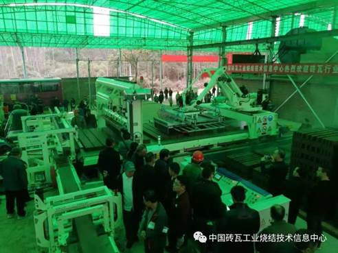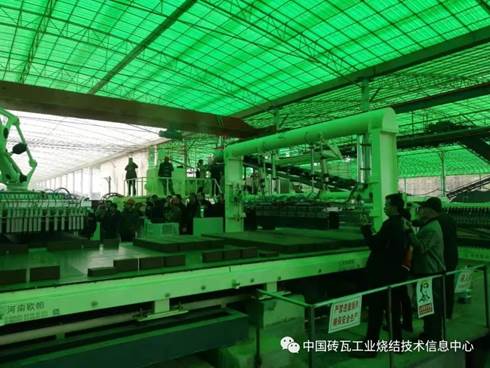 午餐后,大家乘坐大巴车前往贵港市恒盛新型建材有限公司参观,一到现场大家就对该公司的厂容厂貌发出了赞扬之声。该项目为4.8米大断面,使用一台1.6吨欧帕重型码垛机器人,可以生产标砖、多孔砖、空心砌块等多种规格砖型。