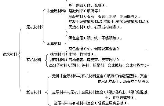 按建筑材料的主要组成成分,可分为无机材料、有机材料和复合材料三大类。具体分类如图所示。