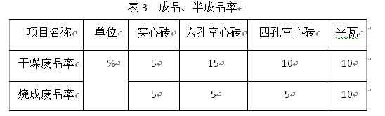 注:1,热耗是由燃料及各种含能工业废渣产生的用于焙烧单位产品所消耗的热量。2,煤耗是用于焙烧单位产品所消耗的各类燃料折合标煤量。包括内掺和外投用煤、干燥用煤以及为加热原料、制砖机组所需的蒸汽用煤和机修方面的用煤。3,电耗是从原料制备至成品堆放的全部生产过程的综合电能消耗量。包括各生产工序动力用电、生产照明用电以及办公室、仓库照明用电。不包括生活用电和基本建设用电。4,确定能耗等级的依据:企业单位产品实际达到的生产能耗等级由经考核确定的热耗和煤耗两项指标任选一项与经考核确定的电耗指标对照表6确定。热耗(或煤耗)与电耗指标同时达到同一等级时,定为该等级。热耗(或煤耗)与电耗指标不同等级时,按低确定等级。5,空心砖等级电耗定额修正值=等级热耗定额×1.2。6,烧结瓦:等级热耗定额修正值=等级热耗定额×1.2;等级煤耗定额修正值=等级煤耗定额×1.2;等级电耗定额修正值=等级电耗定额×1.2。7,硬质原料和硬质燃料等级电耗定额修正值=等级电耗定额+4.8kW˙h/万块×粉磨率。 8,生产高度机械化或自动化,生产工人实物劳动生产率超过750t/(人˙年)的企业,等级电耗定额修正值=等级电耗定额+0.24×(生产工人实物劳动生产率-750)kW˙h/t。9,凡具备多种修正条件的企业,各项能量消耗定额值按顺序进行累计修正。10,凡采取环保措施,达到环保要求的企业,可外加等级电耗定额的5%修正其已经累计修正后所确定的等级电耗定额。11,单位产品实际能耗定额根据全年的统计资料按下式计算:单位产品能耗=能源消耗量(kg)/合格品质量(t)。