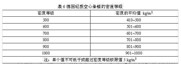 德国标准DIN105《砌墙砖》第五部分就包括有内隔墙用轻质空心条板(后文解释)。该标准中对轻质空心条板的用途规定是用于非承重的内墙体上。规定轻质空心条板的最大密度为1000kg/m3,共分为6个密度等级(见表6)。