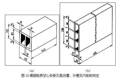 对这类产品的形状和孔洞结构也有一定的要求,轻质空心条板,其孔的结构和孔型可随意设置,但外壁必须大于9mm,内肋厚度必须最小为7mm。图38给出了这些要求的示意图。