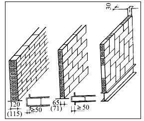 由于隔音要求的不同,分户墙用的空心砖及空心砌块一般要厚一些,而分室墙用的空心砖及空心砌块要薄的多。分户墙有用240mm、120mm、115mm厚的,多为双排孔或多排孔;而分室墙大多数用40mm、50mm、55mm、60mm、65mm、70mm和80mm左右厚度的空心砖及空心砌块,并绝大多数带有榫卯结构。图40所示为内隔墙空心砖及空心砌块实际使用的情况。