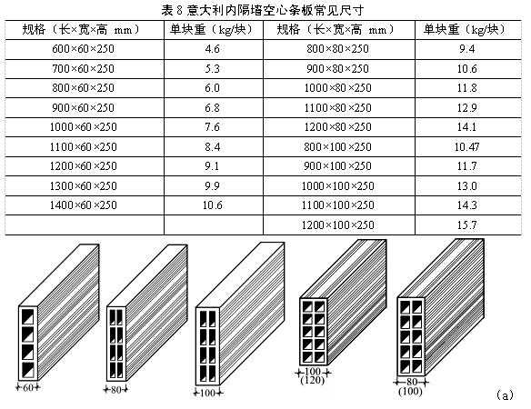 就内隔墙用空心砌块而言,西欧的规格品种非常多。尺寸较大而薄型的空心砌块过去我国翻译为空心条板砖,按照现行国家标准GB/T18968—2003《墙体材料术语》中的定义,叫做砖或板都不准确,应称为空心条板。这一类产品与过去所称之为“层高条板砖”的产品不同,一般未超过1500mm的长度,因此称为条板是合适的。表8给出了意大利内隔墙用空心条板常见的尺寸。图42给出了西欧部分这类产品常见的形式。从图42可看到,隔墙用空心砌块有水平孔方向砌筑的,如图中(a)和(b)所示;也有垂直孔方向砌筑的,如图中(c)和(d)表示的多孔砌块即为孔垂直方向砌筑。
