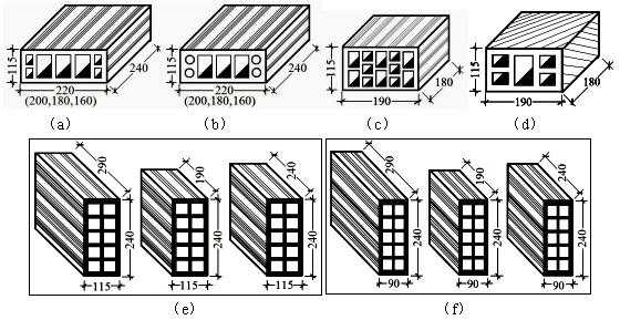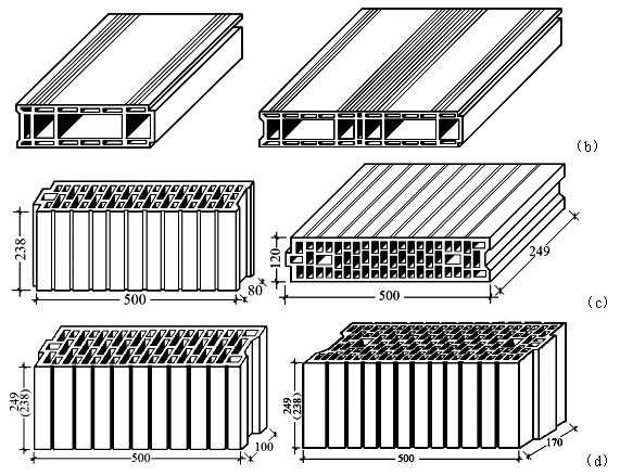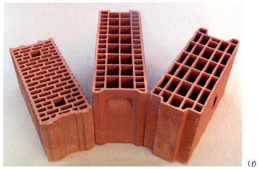 (a)和(b)为意大利生产的隔墙用空心砌块;(c)和(d)为奥地利维也纳山公司生产的垂直孔内隔墙空心砌块;(e)德国艾森砖瓦研究所试验用的层高空心条板;(f)法国生产的垂直孔空心砌块(图片来自法国Michel Kornmann著《Clay bricks and tiles, Manufacturing and properties》)。