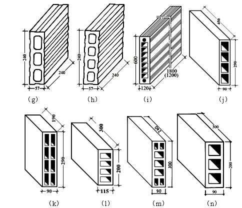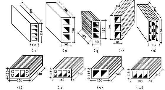 (a)7孔内隔墙用空心砖,空洞率46%,主要用于砌筑220mm,200mm,180mm及160mm厚的内墙体,产地:陕西宝鸡市;(b)7孔内隔墙用空心砖,空洞率45%,主要用于砌筑220mm,200mm,180mm及160mm厚的内墙体,产地:陕西宝鸡市;(c)12孔内隔墙用空心砖,空洞率51%,主要用于砌筑190mm及115mm厚的内墙体,产地:重庆市;(d)5孔内隔墙用空心砖,空洞率50%,主要用于砌筑190mm及115mm厚的内墙体,产地:四川成都市;(e)290mm×240mm×115mm系列空心砖,孔洞率:60%,抗压强度:6.4MPa,密度:907kg/m3,主要用于砌筑240mm和120mm墙体,产地:浙江长兴;(f)290mm×240mm×90mm系列空心砖,孔洞率:54%,抗压强度:6.6MPa,密度:949kg/m3,主要用于砌筑240mm、180mm及90mm的墙体,产地:浙江长兴;(g)3孔内隔墙空心砖,240mm×240mm×57mm,孔洞率32%,密度:1155.2 kg/m3,产地:北京;(h)4孔内隔墙空心砖,孔洞率30.7%,密度:1164 kg/m3,产地:北京;(i)原西安砖瓦研究所试制的条板空心砌块;(j)4孔空心砌块,孔洞率44%,单块重12.33kg,产地:南京;(k)8孔空心砖,孔洞率40%,单块重5.2kg,产地:南京;(l)4孔空心砖,孔洞率34%,单块重7.4kg,产地:上海;(m)7孔空心砖,孔洞率50%,密度:754kg/m3,产地:天津;(n)3孔空心砖,孔洞率35%,单块重7.2kg,产地:上海;(o)4孔空心砌块,孔洞率28%,单块重16.2kg,产地:上海;(p)3孔空心砖,孔洞率46.7%,密度:955.5kg/m3,产地:天津;(q)3孔空心砖,孔洞率38%,单块重3.57kg,产地:江苏;(r)3孔空心砖,孔洞率:53%,密度:790kg/m3,产地:哈尔滨;(s)12孔空心砖,孔洞率:40%,产地:陕西宝鸡市;(t)、(u)、(v)、(w)产地:西安市。