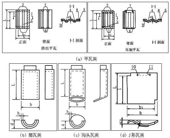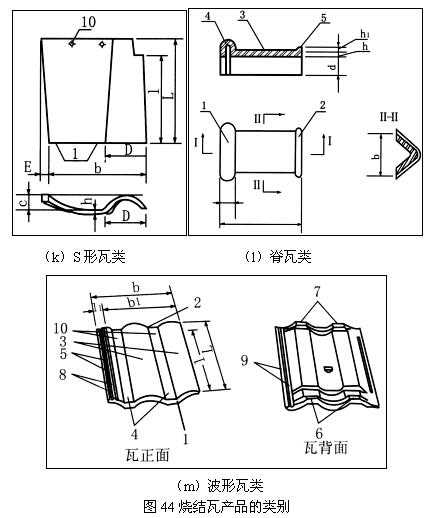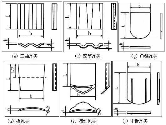 国家现行标准GB/T 21149—2007《烧结瓦》根据形状将烧结瓦分为平瓦、脊瓦、三曲瓦、双筒瓦、鱼鳞瓦、牛舌瓦、板瓦、筒瓦、滴水瓦、沟头瓦、J形瓦、S形瓦、波形瓦和其它异形瓦及其配件共13类。图44表示了这些常见的瓦形。