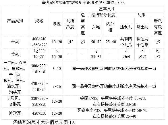 烧结瓦的产品规格及结构尺寸由供需双方协商决定,规格以长和宽的外形尺寸表示。烧结瓦通常规格及主要结构尺寸见表9。