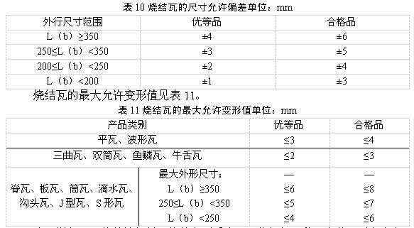 相同品种的烧结瓦产品,上述的5项物理性能合格,根据尺寸偏差和外观质量分为优等品(A)和合格品(C)两个等级。