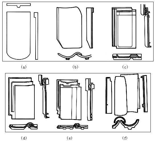 (a)平瓦;(b)波形瓦;(c)改进型平瓦;(d)平面带波瓦;(e)平面连锁瓦;(f)欧洲南部的仰俯(凹凸)瓦(也称西班牙瓦)。