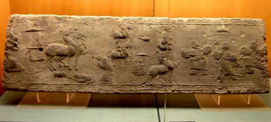 之一: 斜索戏车空心画像砖(为东汉时高浮雕空心画像砖作品,河南新野县出土,该砖高32cm,残长62cm;现存河南历史博物馆,照片摄于河南历史博物馆)