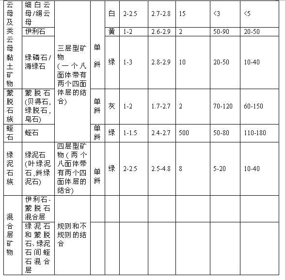 下列表中(表18)比较了各种黏土矿物,不同的判定标准将在后面的章节中详细阐述。