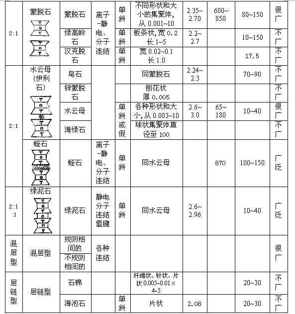 黏土矿物的结构层可以由两层(一层四面体和一层八面体)、三层(两层四面体和一层八面体)、四层(二层四面体和二层八面体)组成。结构层的特征是黏土矿物最重要的分类标志。根据单元层的结构可划分出若干类型的黏土矿物:具1:1、2:1和2:1:1结构层类矿物。自然界还广泛分布着所谓的混层矿物,其结构系由二种或几种结构层类型有规则或无规则地相间排列组成。在每种黏土矿物类型范围内,根据结构层之间相互作用的性质和层间空间的填充情况可划分出若干矿物组。这样,在1:1层矿物类型中划分出高岭石组;在2:1矿物类型中划分出蒙脱石组、水云母组和蛭石组,在2:1:1矿物类型中划分出绿泥石组,而所有具层—链结构的矿物则结合成为石棉—海泡石组。每个矿物组包括一个或数个矿物种类(矿物),它们的化学成分、八面体中各空间的填充情况和结构层的叠置都有区别。表17列出了在自然条件下遇到的主要黏土矿物及其结构特征(前苏联)。