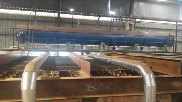首先,窑顶的余热锅炉不但能解决预干燥系统的热源,而且在冬季能给生产车间提供一个温暖的环境,更主要的是能保证刚下线的砖坯不至于因天寒气温低而上冻。再有富裕的话,还能为成型或者原料入库提供热水,更有利于陈化和成型。这尤其适应我国寒冷的北方地区。其次,就是利用对出窑前制品散失不用的余热的充分利用,既节能,而且又有利于装车工的卸车工作环境。第三,也是最重要的,就是能在砖坯进入干燥室前得到充分预热,能够彻底解决砖坯进入干燥室后的凝露塌垛现象。砖坯进入干燥室后,有两种形式的塌垛:一是潮塌,二是淋塌。淋塌是排潮能力不足导致的;而潮蹋就是典型的凝露造成的。砖坯之所以会发生凝露现象,就是因为砖坯进入干燥室初期不能得到很好的预热升温。没条件积蓄够抵御凝露的温度能量。从干燥室中后部抽过来的热气体,在向前一次次地穿过坯缝后,留下热度带走水分。在一次次地穿流过坯垛后,热风温度越来越低,水分越来越高。当这种湿冷空气流动到某一个点时,流动的空气已无力带水分前行,那么水分就会降落凝结在砖坯的表面。这就形成了凝露。凝结在坯体表面的露珠被坯体吸收,当吸收的量超越底部负重坯体的强度极限时,坯垛就会彻底垮塌。潮蹋的砖坯一般都是上部完好而底部软化酥裂碎塌。这是因为热空气轻而上浮,上部砖坯的温度就会高于下部砖坯的温度。夹带有接近饱和水分的湿重空气在底部流动,在向前流动过程中,遇到没有任何温度基础做抵御的湿冷砖坯,凝露潮蹋就在所难免。