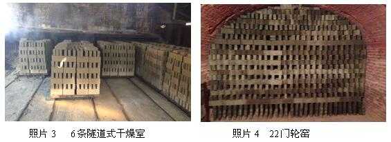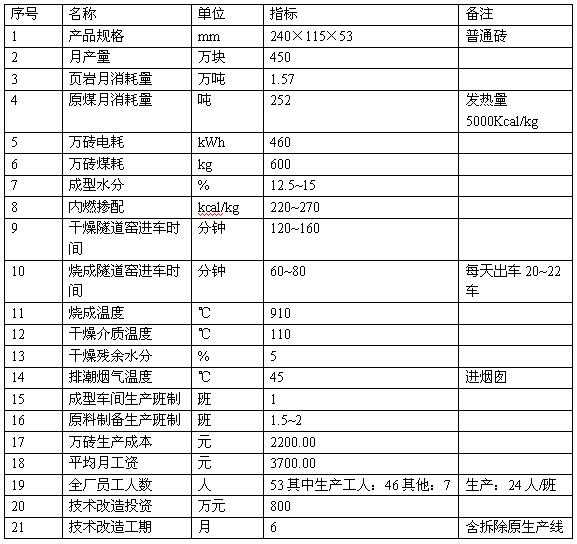 根据《贵州省墙体材料行业规范》限制,技术改造实施方案中“一次码烧”工艺流程,全年产量需要达到5000万块。该企业技改后,生产实践表明,主要热工设备2条截面为3.48m、长度77m隧道干燥室和1条截面3.48m、长度123m烧成隧道窑,月产量达到450万块普通砖,按照当地年生产时间11个月计算,能够实现我省墙材产业规范要求。当生产空心砖时,生产规模能够超过规范要求。