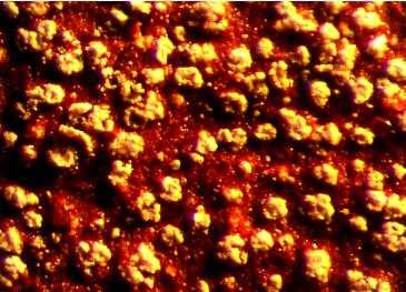 德国2005年的研究表明,砖表面的电子显微镜照片显示出表面泛白决不是在表面上有均匀的、轻度颜色的矿物材料的覆盖层,而是由大量的像火山小丘一样的构形组成,在小丘中部有可辨认出的小洞,如图2所示。
