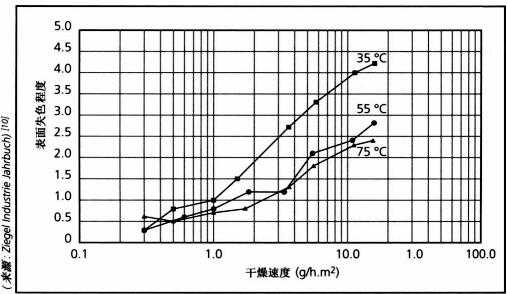 德国艾森砖瓦研究所2005年的研究表明,干燥初始速度非常慢时,最初泛白的量非常高,此后降低到最小,然后再次增加,直到最后不再泛出。即从坯体中迁移到坯体表面的硫酸钙的强度和干燥速度有关,干燥速度愈慢,泛出硫酸钙的强度就愈大。随着干燥速度的增加,泛出的强度降低到最小,此后随干燥速度的增大,泛出的强度再次上升,并最终达到最大,此时在更高的干燥速度情况下,泛出强度再次下降。充分说明泛白的强度和干燥的条件关系极大。所以适当的干燥制度可减缓泛白的程度。