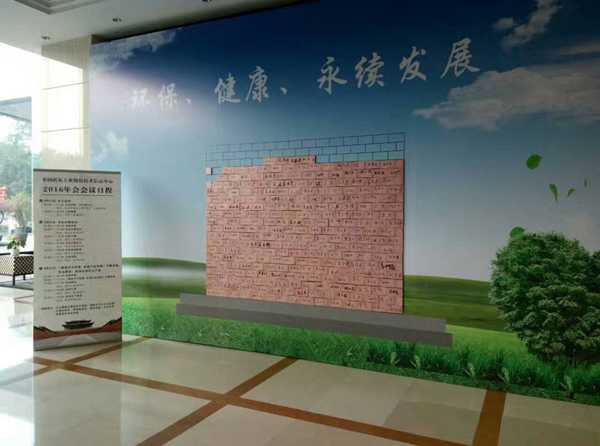 此次年会,会期从9月23日到9月25日共三天。9月23日报到当天,从全国各地赶来的各省市墙材协会、墙材设计院、砖瓦企业的三百余位代表陆续抵达桂林市漓江大瀑布酒店,酒店前台的签到处一直延续到深夜十一点。签到处还专门设立了砖瓦行业“添砖加瓦墙”,“添砖加瓦墙”上方为蓝天白云,下方为绿色草地,每位来宾到场签到后工作人员会赠送给来宾一块特制“砖”,来宾签名后由工作人员将此“砖”粘贴在“添砖加瓦墙”上,寓意:广大砖瓦同仁携手为中国砖瓦事业环保、健康、永续发展,贡献着自己的力量。