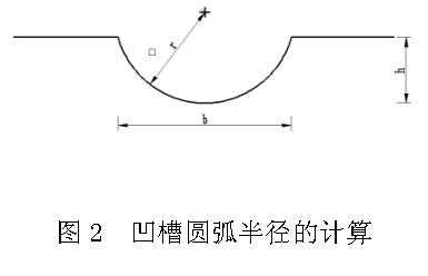如上所述,弧形断面的凹槽少有发现凹槽裂纹,对于较宽又较浅的凹槽更无法采用半个圆周的弧形,在设计凹槽时往往是先确定了凹槽的宽度和深度,此时的凹槽的圆弧半径如下(图2):