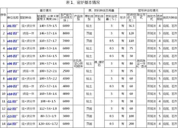 表1、环保设施基本情况:窑炉基本情况:窑的种类、隧道窑(长X宽X高)、产品类型。原、燃料种类及用量:原料类型、燃料类型、燃料含硫量。窑环保设施情况:有无环评、环保投资、除尘方式、脱硫方式、喷淋层数、脱硫剂种类。