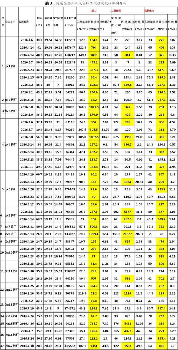 表3、隧道窑企业烟气实际工况检测数据纵向分析。