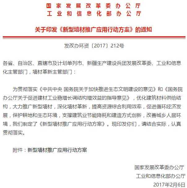 新型墙材推广应用是建材工业推进供给侧结构性改革的有效抓手,墙材革新是大力推进生态文明建设,促进循环经济发展的重要举措。自上世纪九十年代以来,墙材革新为建材工业和城乡建设可持续发展做出了重要贡献。但我国城乡区域发展不平衡,空间开发粗放低下,资源约束趋紧,生态环境恶化趋势尚未得到根本扭转,遏制毁田烧砖、节约保护资源,发展本质安全、节能环保、轻质高强的新型墙材也成为建材工业亟待破解的发展难题,也是建材工业坚持创新驱动增强发展内生动力的客观要求。为加快推进墙材革新,推广应用新型墙材,制定本行动方案。