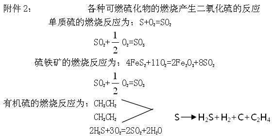 其中单质硫、硫化物硫、有机硫为可燃硫,可在燃烧中产生二氧化硫气体,或在煤的燃点前低温分解析出二氧化硫。而硫酸盐硫属于非可燃性硫,不参与氧化燃烧反应,不产生二氧化硫。一般燃料化学分析测定的全硫包括各种硫的总量,但其中的可燃硫在1100℃以下燃烧时都能先后产生二氧化硫,而非可燃硫则不会燃烧产生二氧化硫。所以,还应该尽可能对燃料进行矿物组成的分析测定,搞清楚具体有哪些可燃硫,有多少可燃硫,以便针对不同的可燃硫准确选用和掺配相对的固硫剂(见附件2:各种可燃硫化物燃烧产生二氧化硫的反应)。