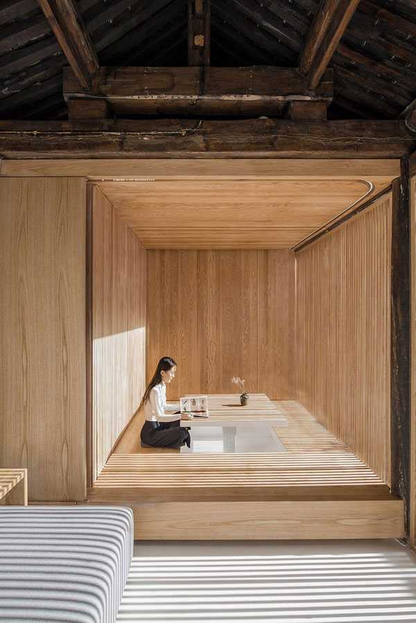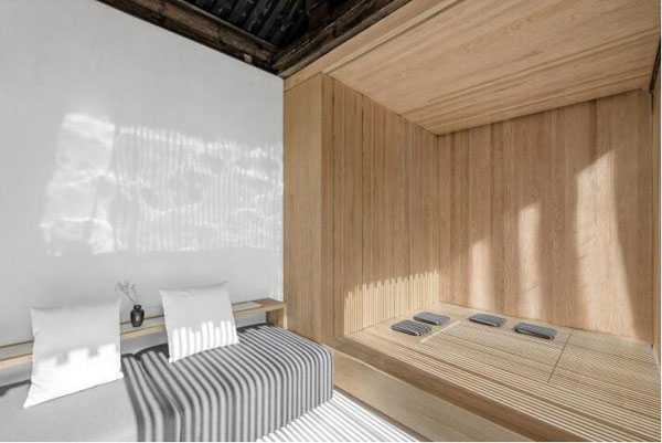 小院儿的使用主要作为城市公共活动空间,同时也保留了居住的可能性。四间房屋可被随时租用来进行休闲、会谈、聚会等公共活动;同时也可以做为带有三间卧室的家庭旅舍。整合式家具用来满足空间场景的这种弹性切换。东西厢房在原有木框架下嵌入了家具盒子。木质地台暗藏升降桌面,既可作为茶室空间,也可以作为卧室来使用。北侧正房也设有翻床家具墙体和分隔软帘,同样可以满足这种多用需求。