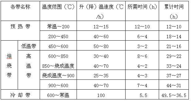 说明:①烧成温度由各地的原料物理性能决定; ②焙烧窑断面上下温度差控制在20℃~40℃为宜;③焙烧时间越长,制品的强度越高;