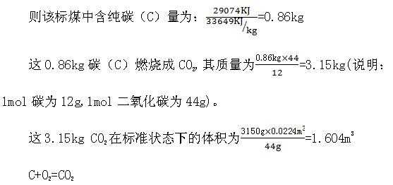 以上为硫(S)刚好完全燃烧需要的干空气量,下面以同样方法计算碳(C)刚好完全燃烧需要的干空气量:该标煤中碳(C)的发热量为29260KJ-186KJ=29074KJ