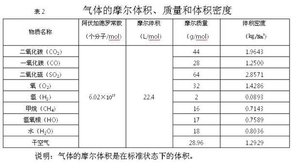 (查表2:气体的摩尔体积、质量和体积密度)。
