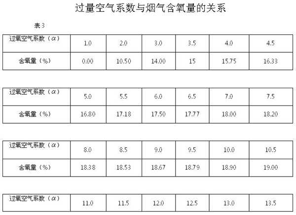 ③一般测得的为烟气中的含氧量,需按公式折算出过量空气系数,或查表3