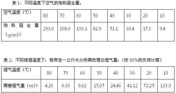 表1已经列出了烟气在不同温度下的饱和湿含量,理论上讲,当烟气温度从80度下降到30度时,就有90%的水分从烟气中分离出来,饱和含湿量就会从300g/m3降到30g/m3。在排出前,如果再升温到40度时,烟气就会变成不饱和湿烟气了(40度时的饱和湿含量约为51g/m3),不饱和湿烟气在排出的时候就不会形成白色水雾了。