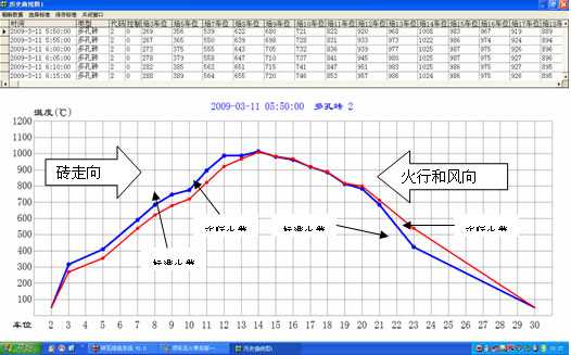 如果按标准火带曲线烧砖,当实际火带曲线(红线)与标准火带曲线(兰线)重合即顶车,就可实现定温定点的焙烧。
