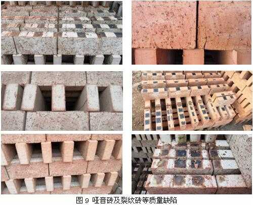 砖垛第一层(由上向下计算)成品,敲击哑音,第2、3、4、5、6层成品较好,音质正常,而第7、8、9、10、11、12、13层成品音质较差,同时存在条面裂纹、断砖等产品缺陷,普通砖强度标号不高。见以下图片9。