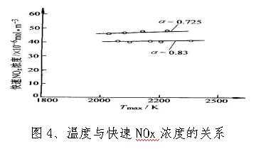 第二个区域0.7≤α≤1,有相当数量的快速NOx生成,但还未达到与火焰最高温度相对应的NOx平衡浓度,NOx在火焰带后端的高温区域内生成。