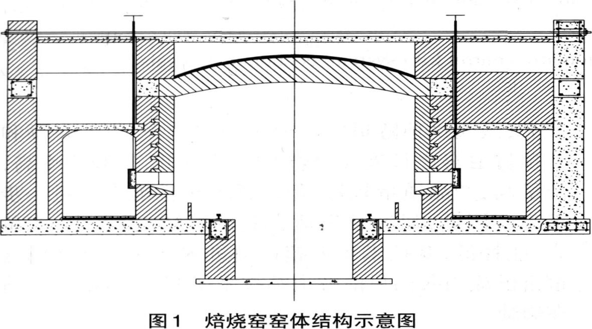 在窑体结构上,采用了钢筋混凝土基础。窑体两外侧墙为烧结砖砌体结构,窑体焙烧带两内侧墙采用内为耐火砖、外为烧结砖且两者中间相互搭接的复合砖砌墙体结构。预热带、冷却带两内侧墙为烧结砖砌体结构。两外墙中与拱顶蹬脚水平等高处设有纵向钢筋混凝土梁,竖向置有间距相等的钢筋混凝土立柱,立柱下侧与钢筋混凝土基础相连接,中部与纵向钢筋混凝土梁十字交叉,上端采用箍柱拉筋,在窑顶拱顶砖蹬脚处的两内侧中设计有耐热混凝土纵梁。窑体两外侧墙与内侧墙之间砌有多道横向内撑墙将之相连接,使窑体形成一个立体钢性结构,并使窑顶拱顶砖的水平向外推力传至立体钢性结构上,从而形成窑体自固和有效控制窑顶向外推力,以有效地确保窑体与窑顶的安全性能和保温隔热性能。焙烧窑窑体结构见图l。